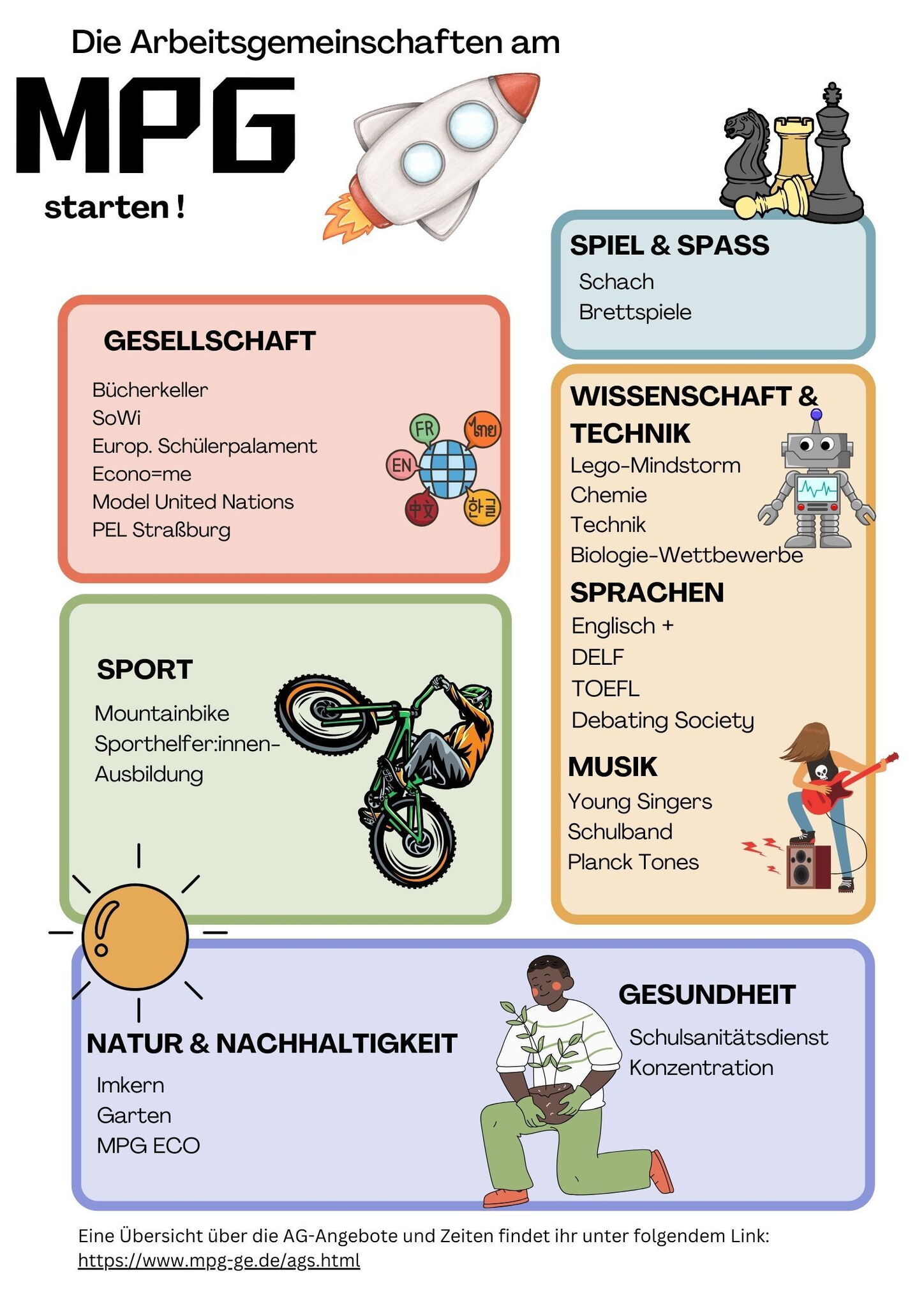 Dies ist nur eine Auswahl aus unserem aktuellen AG-Angebot, welches regelmäßig aktualisiert und erweitert wird, um den Interessen und Bedürfnissen unserer Schüler:innen gerecht zu werden. Der aktuelle Plan steht zum Download bereit.